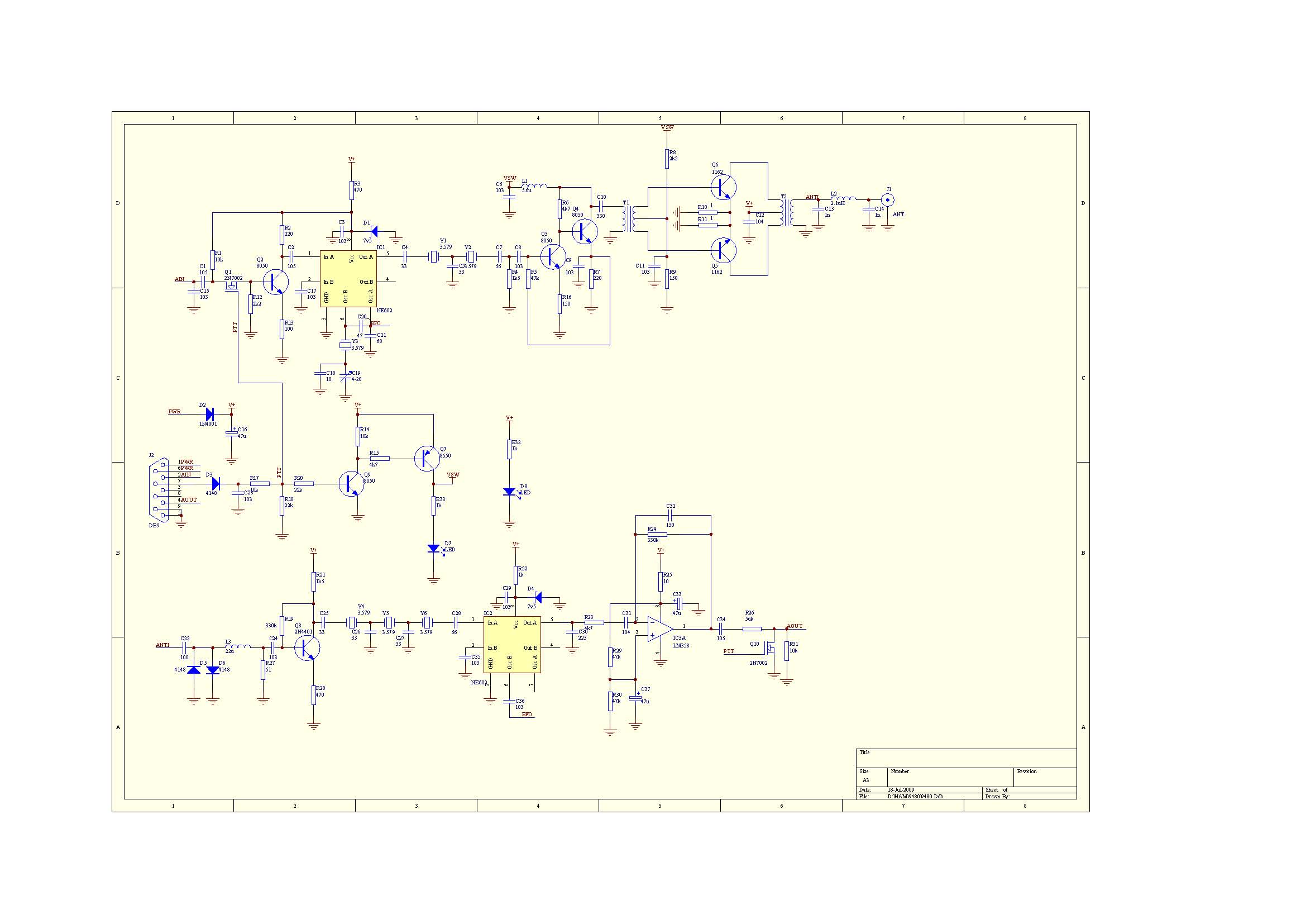 电路图见上图。声卡产生的发射音频由Q2放大后送入IC1(NE602)的1脚。Q1是一个开关,由键控部分控制。IC1用一颗3.579MHz的晶体产生本振信号,调制后的信号从5脚输出给晶体滤波器。R3和D1、C3则用来给IC1和Q2提供7.5v的工作电压。假如输入的音频信号是1kHz的PSK31信号,Y3形成的本振是3579kHz,那么从5脚输出的就是3578kHz和3580kHz以及幅度较小的3579kHz三个信号。其中的3578kHz就是我们需要发射出去的差频信号(下边带)。